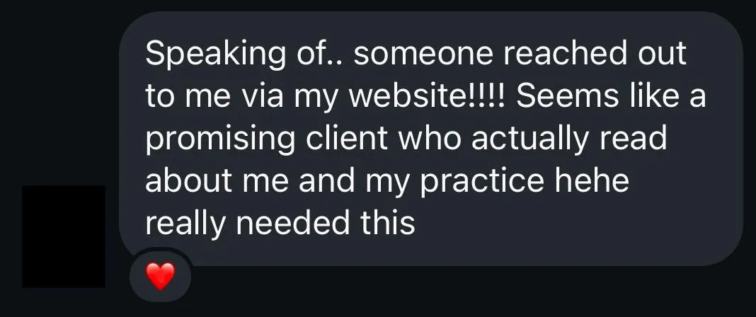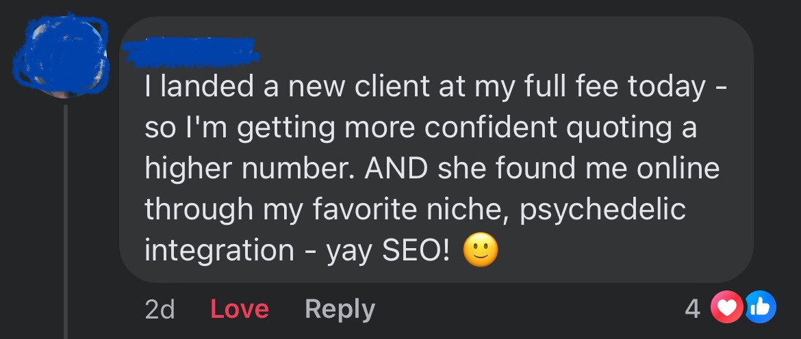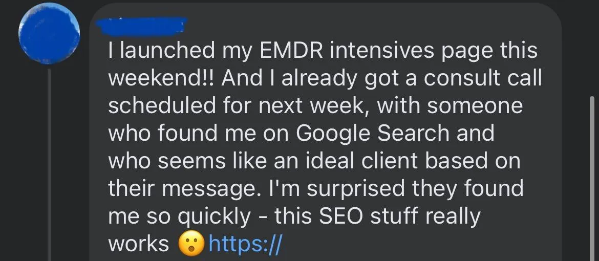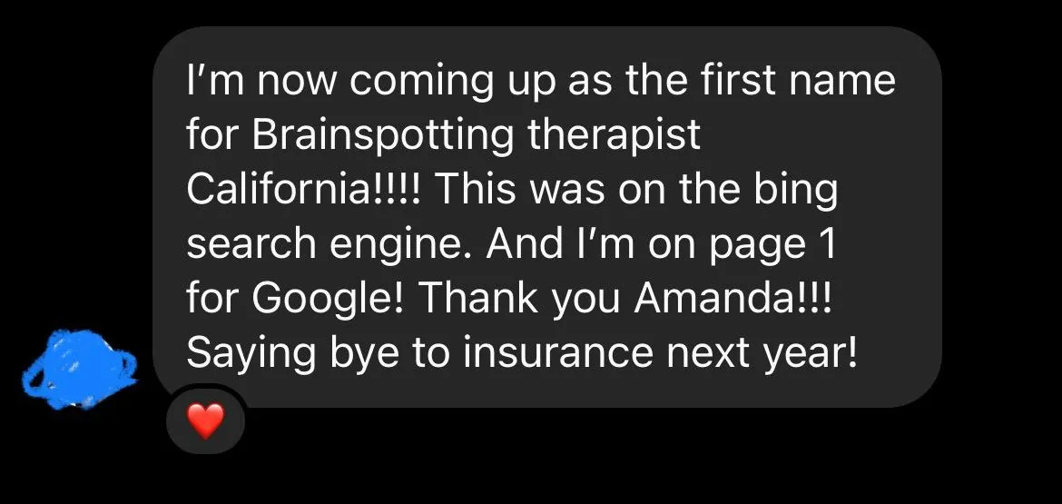 "I just received a random email from a therapist in CA who said I have strong SEO and wants to know who I use. She googled 'trauma therapist NYC' and I was top 5 on page 1 which is a big deal since it's NYC!"